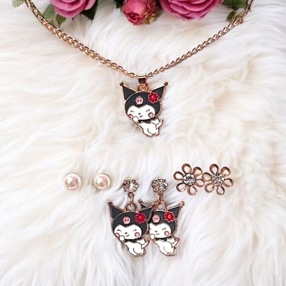 This is a super cute Kuromi set with a necklace and 3 pairs of earrings. The necklace is 18” in length. Get this for any Kuromi lovers. You will not be disappointed. I have other Sanrio characters in this set as well. Check out my closet for more.
