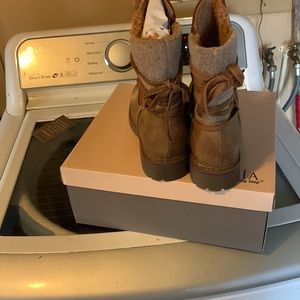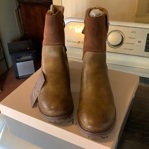 These are a great pair of boots. Known for comfort. They are great ankle boots with a flare of side lacing side zip. Mixed materials giving texture and richness. Looks great with jeans.Bran new in box.