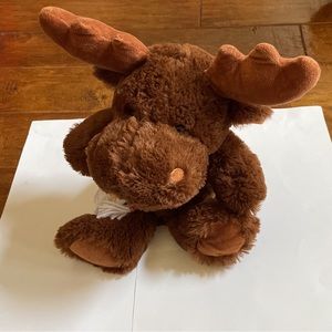 Adorable Moose wearing a red and golden yellow scarf. Stuffed, super soft, plush toy.