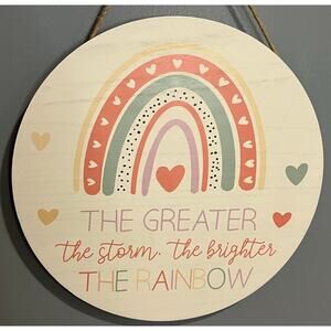 - Has "The greater the storm, the brighter the rainbow" written on it