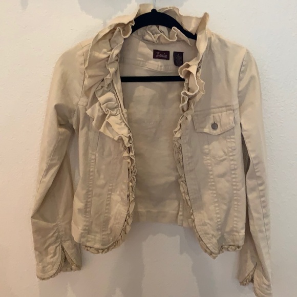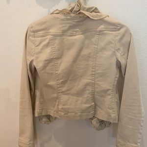 Very feminine light-weight denim jacket. Features a layered, ruffled collar that makes this piece unique, and an added ruffle at base of full-length sleeves. Approx. 17” from shoulder to hem.