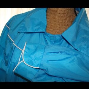 Vintage 1980's windbreaker/rain jacket in a brilliant blue turquoise with bright white piping at cuffs, on pockets, and encircling chest shoulders, and back.