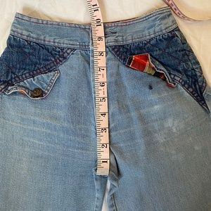 Super cute distressed vintage 70s bell bottoms! These are definitely meant for the petite frame. Considerable wear and distressing throughout. They have what looks to be bleach stains on the front and back as well as stains. They’re missing a button on the front left and have a hole on the right leg. The seam has also been let out on the bells so they have fraying on the edges. **Please see pictures for condition**