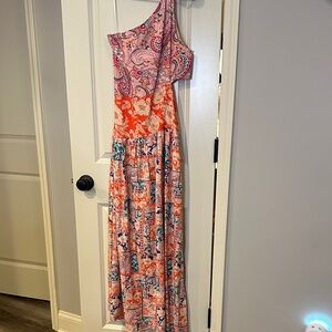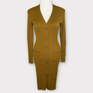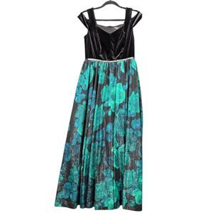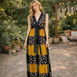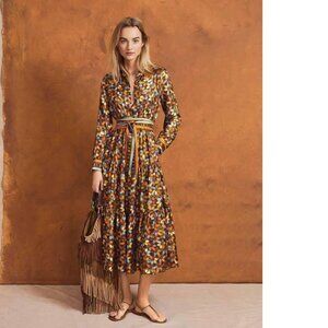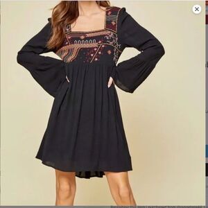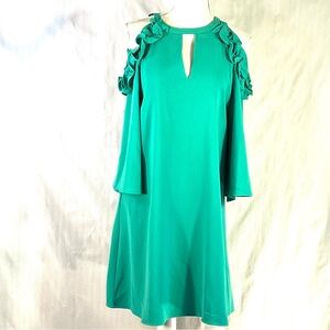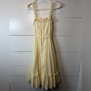 Runs small, this dress features grey pearl snaps up the front and ruffles at the neck and down the chest.