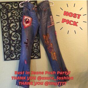 Super fun, boho, and hippified bell bottom Long and Lean jeans from Gap. Great conversation piece and fun to wear. Genuinely UNIQUE and ONE-OF-A-KIND pair of jeans! Piece of true wearable ART! Super comfy! Size 10R. Measurements are in the photos.