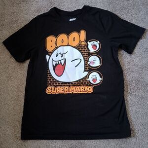 Black t-shirt featuring Super Mario Boo graphic. Bold orange and white design. Super Mario Boo Youth Graphic SS T-shirt Black Size XXL (18) PRE-OWNED. In good condition, gently used.