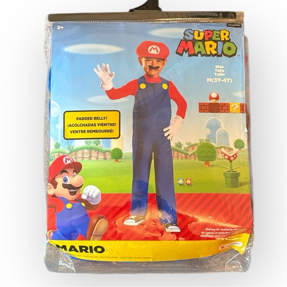 New in the bag Mario Halloween costume, size 3t-4t. Includes jumpsuit, detachable belly, gloves and hat. Never worn.