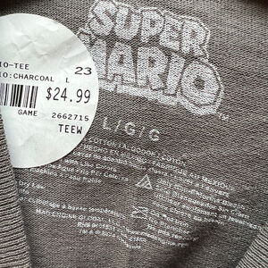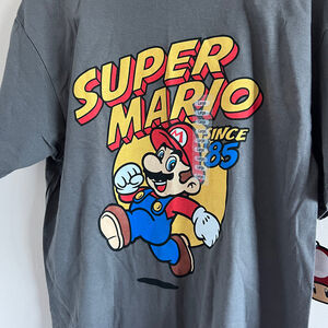 Casual gray t-shirt featuring Super Mario graphic. Lightweight and comfortable. Retro gamer aesthetic.