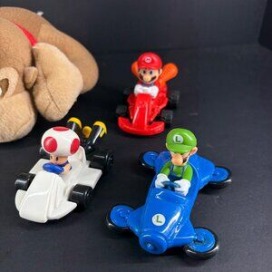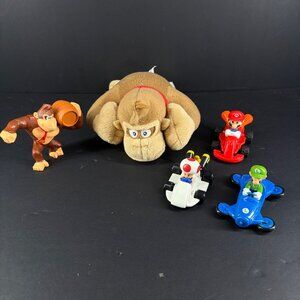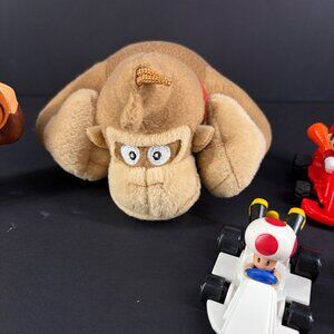 • Set includes 5 pieces: Donkey Kong plush, Donkey Kong figurine, Mario, Luigi, and Toad in karts