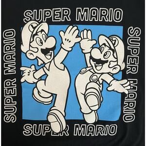 Officially licensed Super Mario graphic T-shirt! Featuring a classic black design with retro-style Mario and Luigi graphics on both the front and back, this shirt is perfect for gamers and nostalgia lovers alike.