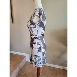 Black and White Bodycon dress. Cap Sleeves. Some Red Rhinestones on front of dress over some of the model's lips. No tag, No size. Appears to be a small. In good preowned condition. Smoke free home.