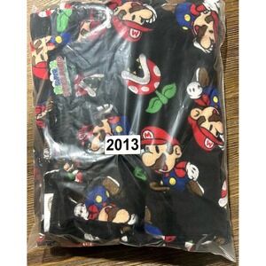 These black pajama pants feature designs of Super Paper Mario and Piranha Plants, characters from the Supermario Brothers franchise. They have a drawstring closure and are labeled as a men's size large, measuring approximately 29.5x27.75 inches. The pants are themed around cartoon, video game, movie, and superhero characters, catering to fans of retro 80s and NES gaming. Suitable for all seasons, these pants offer a fun and nostalgic touch to your loungewear collection.
