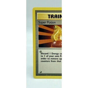 Up for auction is a rare vintage Super Potion Trainer card from the 1999 Base Set of the Pokemon TCG. This English card, illustrated by Kenji Kinebuchi, is made of high-quality card stock with a regular finish. It features the card number 90/102 and is classified as a rare card.