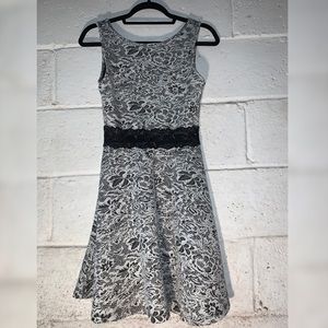 Mock Lace Patterned Dress with Black Background and White Overlay. Floral Patterned with Black Lace See-Through Band at Waist. Super Comfy!