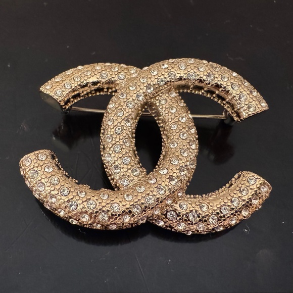 This iconic Chanel brooch with gold finish and sparkling crystals is stunning and can elevate any ensemble.