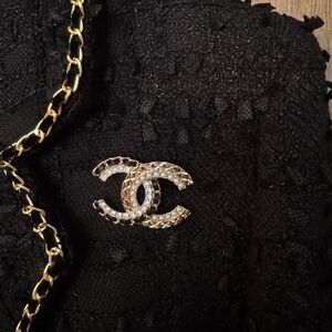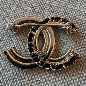 SOLD OUT Super Rare Classic Chanel CC Logo Leather Chain, Pearl, Crystal & Gold Brooch. This brooch is perfect for adding a touch of glamour to any outfit, whether it's a formal event or a casual day out. It is a timeless piece that will never go out of style.