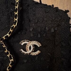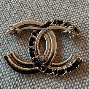 SOLD OUT Super Rare Classic Chanel CC Logo Leather Chain, Pearl, Crystal & Gold Brooch. This brooch is perfect for adding a touch of glamour to any outfit, whether it's a formal event or a casual day out. It is a timeless piece that will never go out of style.