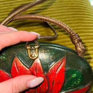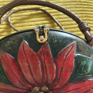 Original brown satin lining. Stunning Christmas design, carved red poinsettia flower with green and gold accents. Its unique craftsmanship makes it a standout accessory.