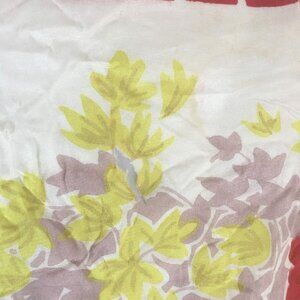 • Cream background with green and brown leaves, red flowers, and blue, yellow, and red butterflies • One large butterfly in the center and four medium butterflies in each corner • Thick red dashed line boarding scarf • Polyester fabric • Thin fabric • Lightweight fabric • Two small tears (1 inch) • 32 inches square