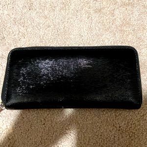 Used Black Michael Kors Wallet- with gold detail. Only issue is some of the black stuff around the wallet pealed off in corners. Mid condition
