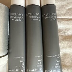 Living Proof hair care set includes styling treatment, shampoo, conditioner, and dry shampoo. Perfect for hair care routines.
