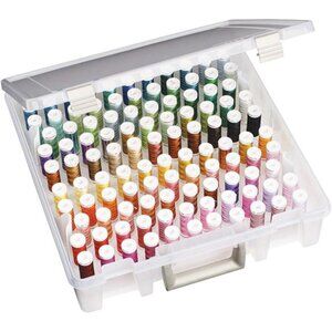 Introducing the ArtBin Super Satchel™ Thread Box – your ultimate storage solution for machine and embroidery sewing, as well as quilting spools. This meticulously designed thread organizer ensures that your crafting essentials are neatly stored and easily accessible whenever inspiration strikes. With two removable white thread trays, this thread box accommodates all major brands of machine and machine embroidery spools, including those large 1500-yard spools that can be a challenge to store. The thoughtful peg design provides an impressive storage capacity of up to 224 20mm spools, 108 32mm spools, and 30 45mm spools – making it a versatile choice for various thread sizes. Equipped with secure latches, the Super Satchel™ Thread Box