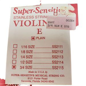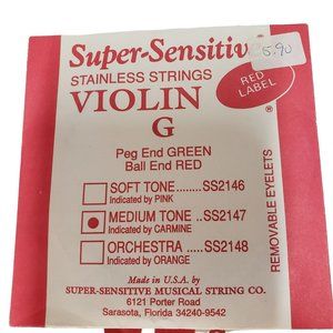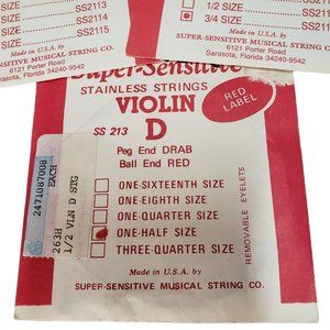 Includes 4 miscellaneous violin strings, all with removable eyelets, Super-Sensitive Red Label stainless strings, made by the Super-Sensitive Musical String CO, Made in the USA