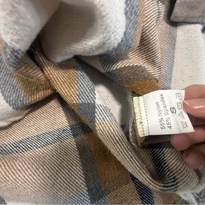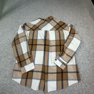 Cozy, stylish, and versatile! This like-new flannel shacket features a warm tan, cream, and black plaid pattern, perfect for layering through fall and winter. With a soft, slightly stretchy fabric made from 55% nylon and 45% spandex, it offers both comfort and flexibility. Features include: