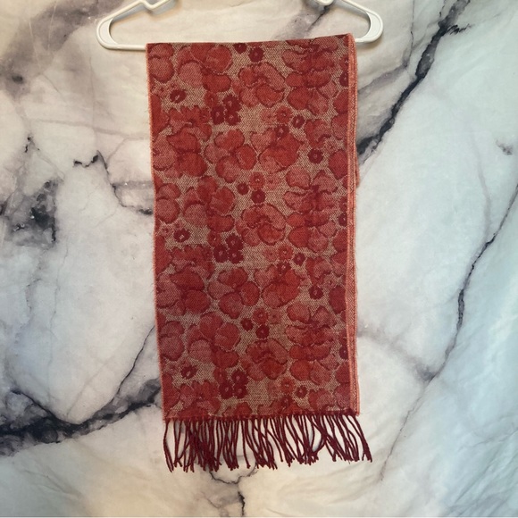This floral patterned scarf has been gently loved and is in great condition! It features and coral and raspberry colored floral pattern and has no rips or stains.