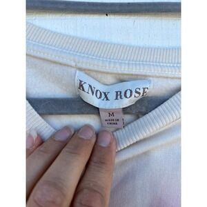 Knox Rose soft (like REALLY soft) sweatshirt- with all the colors of the fourth of july! This is great for a chilly 4th of July evening with tie dye red, blue, and off white. Light beige sweatshirt, gathers a bit at the sleeve. Really comfortable