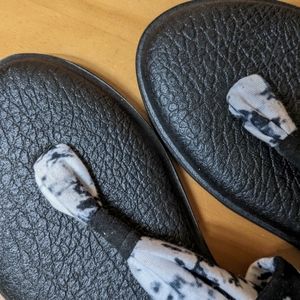 This particular pair has a neutral and super versatile soft white & black random dye pattern that works with shorts or a skirt or dress. Preloved with no nicks or scuffs, stains or odors of any kind. The toe thong fabric had some very slight darkening so they've been washed and thoroughly sanitized, just because.