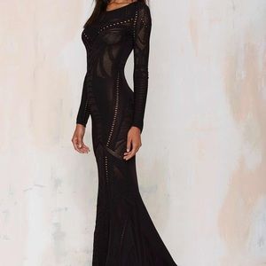 The Drease Dress is made in black knit and features intricate lace design, maxi length and flare silhouette from knee to hem. Semi sheer, unlined. NEW WITH TAGS
