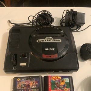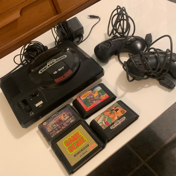 Original and vintage Sega Genesis console with 5 games and two controllers and all connecting cords for immediate play. Comes with five games: sonic 1 and sonic 2, toe jam and earl, toejam and earl in funkotron, and a 218 games-in-1 mega drive cartridge (see list of games in photos). Also comes with Sega genesis game genie video game enhancer and list of codes.