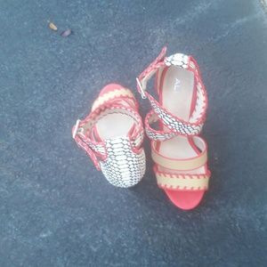 These are tan in the lower straps and a black and white snakeskin print on upper straps and the heel has a suede like feel. The heel on these are about 5 inches. I wore these once to a concert. I'm only giving them away because the colors don't fit into my wardrobe anymore.
