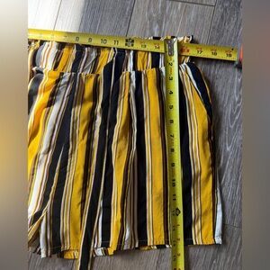 Stylish women's shorts with pockets featuring bold yellow, white and black stripes. Perfect for a casual day out.