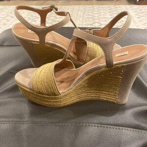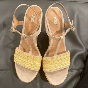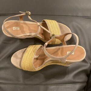 Super cute and super comfortable. Classic UGG comfort. Gently worn 2 times. The heel is 4 1/2 inches tall. The platform at the toes is one and a half