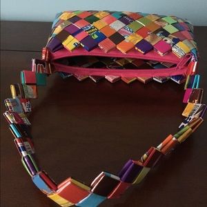 This mini handbag is made of woven candy wrappers. The wrappers create a sparkling multicolored mosaic effect. Has a pink Zipper closure. The Shiny candy wrapping decorates the exterior, interior and strap. What a sweet treat to hang in your closet!
