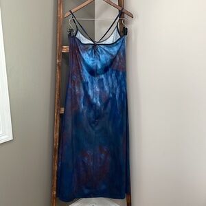 Super cute cosmic maxi w/brown crochet detail in front. 2 long slits in front bottom of dress. Criss cross straps in back.