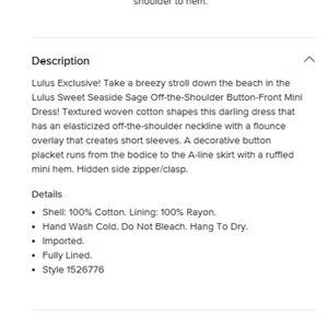 Dark sage color. Off the shoulder silhouette. 100% Rayon with a cotton lining.
