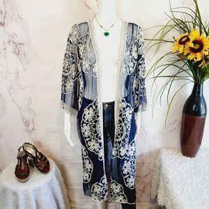 Excellent condition no flaws beautiful embroidered long length kimono style one size fits up to a large. Navy blue ivory white color embroidered flowers.