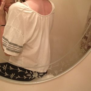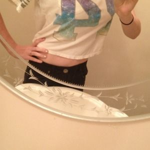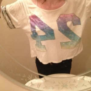 Gray lines on sleeve, colorful number 24 in middle. Little worn. Back dips a little bit. Can show belly with long torso if no tank top underneath.