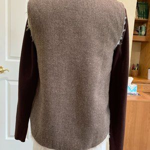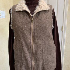 Faux fur/Brown herringbone reversible vest, zip front, with large side pockets. Looks great with jeans and boots, or dressy pants. The brown herringbone side looks and feels like lightweight wool, furry side is oatmeal color. Size S, but would fit a small M, Excellent condition!