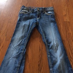 Size 29. To big for me worn one time. Light wash color slim boot cut
