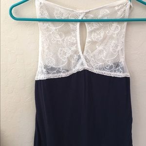 Navy blue with a lace top, bottons along the front and a super cute knot at the bottom!