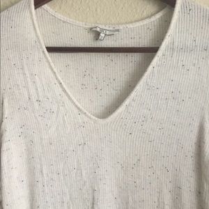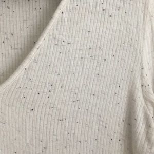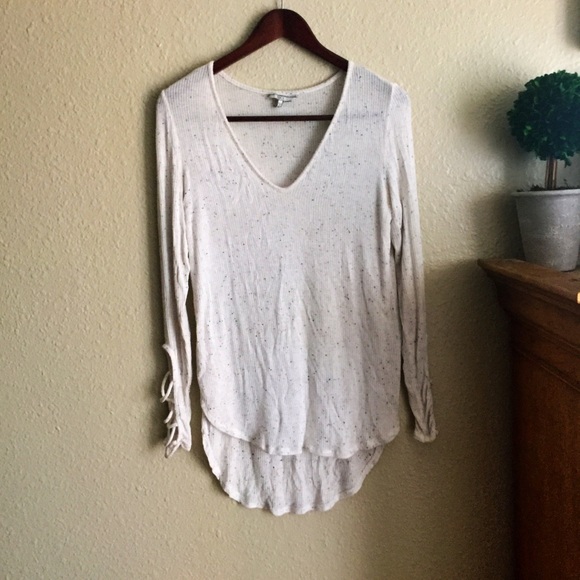 Only worn a couple of times. No visible sign or wear or damage. Adorable high low speckled grey/off white long sleeve with criss cross sleeve details. This shirt is so soft and lightweight. It goes well with any outfit. Summer or fall