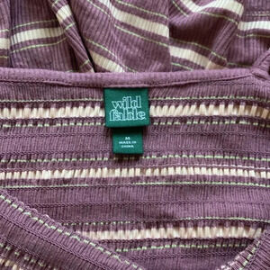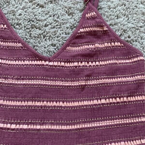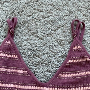 You will feel super comfortable in this romper the bottoms are flown and the top is stretchy. It’s a v neck with adjustable spaghetti straps. The color of the stripes are mauve, pale pink and beige