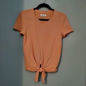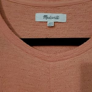 Super cute Madewell short sleeve top in a very pretty peachy color. Textured 100% cotton thread stretchy fabric. Never worn but fabric and care instruction tag was cut out. NWOT condition. Color is more like the lighter pics.