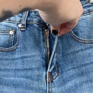Super Down Jeans Womens 24 Skinny Medium Wash Cotton Denim. Classic 5 pocket closure. Zip fly and button closure. Whiskering at hips. 97% Cotton, 2% Polyester, 1% Elastane.