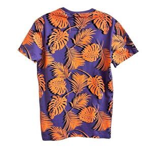 Purple fitted tee with neon orange and black tropical leaf print.Vintage look SuperDry logo. Mens.