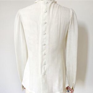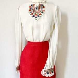 Super rare 1960’s Hungarian Bavarian Peasant Blouse. Lanz of Salzburg. Vintage perfection! Semi sheer (would reccommend a tank or something underneath). Ruffled mock neck. Button embroidered sleeves. Full button back closure. In excellent gently used condition. Some minor spots of discoloration. Nothing major or noticable on. No size tag. Fits like a modern day small. Could fit an XS in a looser fit way too. Will list as both, but there’s only one available. See measurements below and ask questions if unsure of fit. Laying flat, buttoned, unstretched: P2P- 18” W- 16” L- 24.5” Please note: - If the item appears smaller than the listed measurements on the mannequin, it’s because it was too big on the mannequin and was pinned back to show fit. - I’m doing a MASSIVE clear out of all of my grandmas vintage collections and closet. Check out all of the other recently listed vintage in my closet and make a bundle of multiple pieces for a better offer! :)